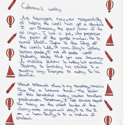 Together with all the pupils at our school, we have included Catriona in our school prayer which is learnt off by heart by all pupils and said regularly during both class and school prayer time. Every year in November around Catriona’s birthday, the school runs a writing competition across the school in memory of Catriona and to celebrate the love of writing which she confidently showed both at home and in school. Mr. and Mrs. Fathers donate extremely generous book tokens to the winners in every year group. It is an event in which all pupils really enjoy participating in, and the special assembly is very well attended by many parents and friends of St. John’s School. We are extremely grateful to both Mr. and Mrs. Fathers for their continued support in running this writing competition.